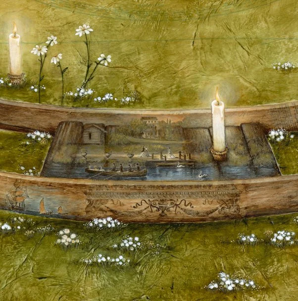 Here I’ve painted into the collage elements to blend, add depth, and to bring the rocking horse and the fox to life. I use acrylic paint, at times with glazing mediums added to it.