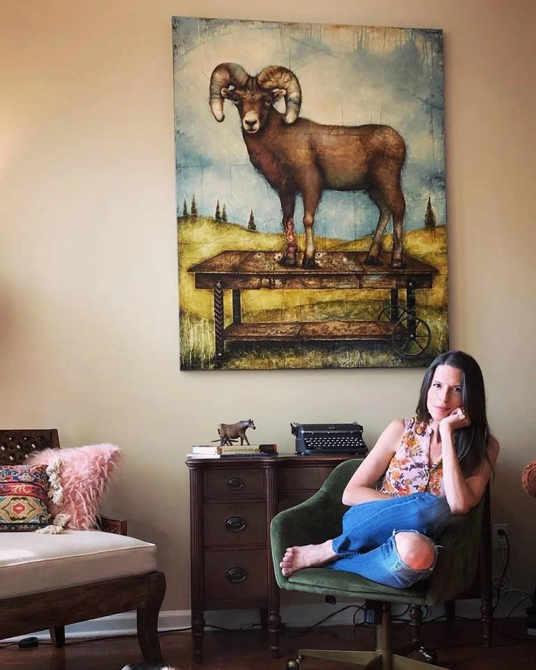 With that in mind, and with the pink sofa in mind, I turned to my own work for inspiration. Previously, I’ve done pieces with sofas, a chaise lounge, and also with chairs. I went to my website and just started scrolling through all of my past work and thinking about what direction I could take this pink sofa. Fairly quickly, a rabbit is there. And then in my mind the sofa becomes a chair.